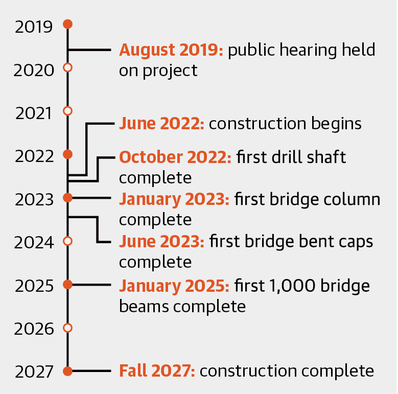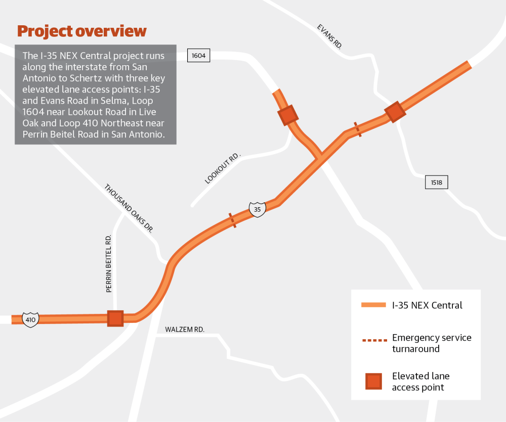 Totaling $1.5 billion in design and build costs, construction began in June 2022 from contractor Alamo NEX Construction. The project creates three elevated lanes, comprising two main lanes and one high-occupancy vehicle, or HOV, lane, for both northbound and southbound directions. The elevated lanes will provide direct connections to Loop 410 North and Loop 1604 West, according to the Texas Department of Transportation.