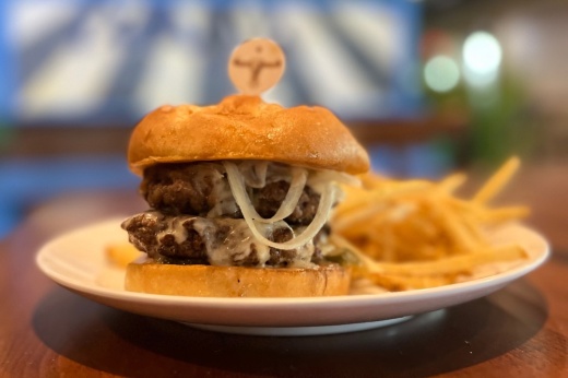 - Gettin' Smashed Burger which includes two burger patties topped with American cheese, pickles, thin sliced onion and burger sauce.