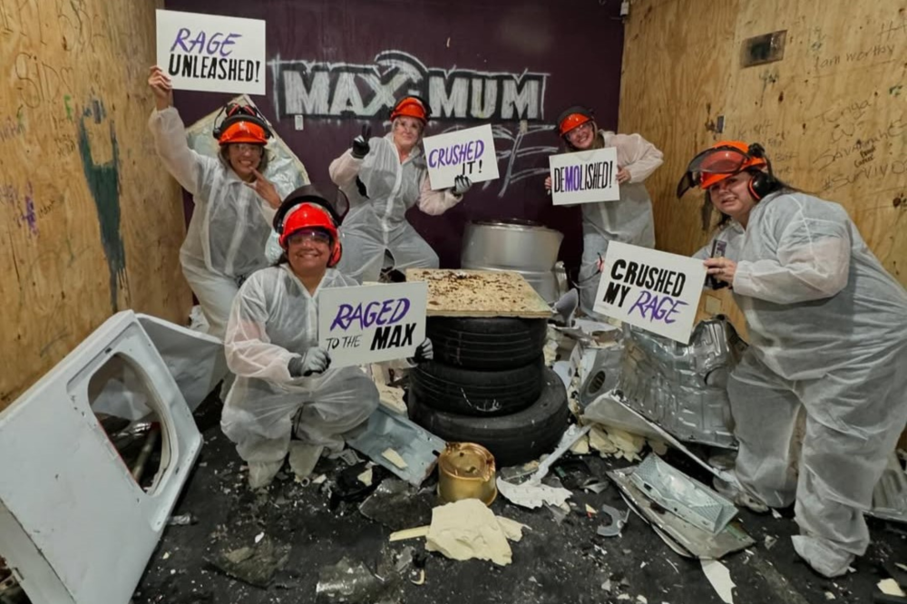 The rage room at Maximum Rage is for those seeking a high-energy release in a safe environment. Guests can smash items to let off steam. Sessions range from 10 to 45 minutes and are open to anyone eight and older.