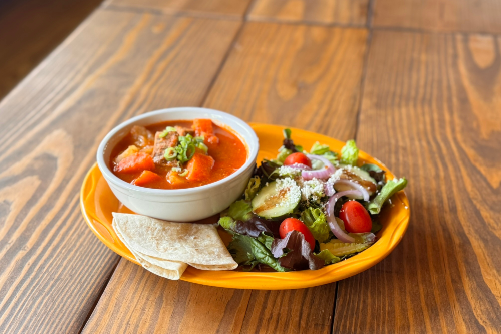 - Carne special: cup of carne guisada, beef empanada, house salad and churros or fruit